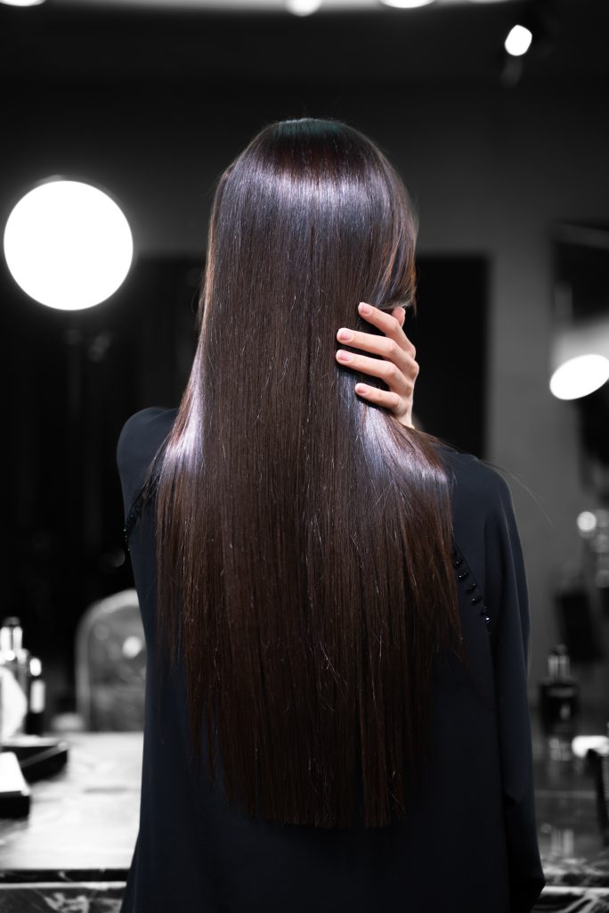 After rinsing, the hair is blow-dried and sealed with a custom finishing serum. The result: dense, weightless, visibly healthier hair that reflects light like silk.